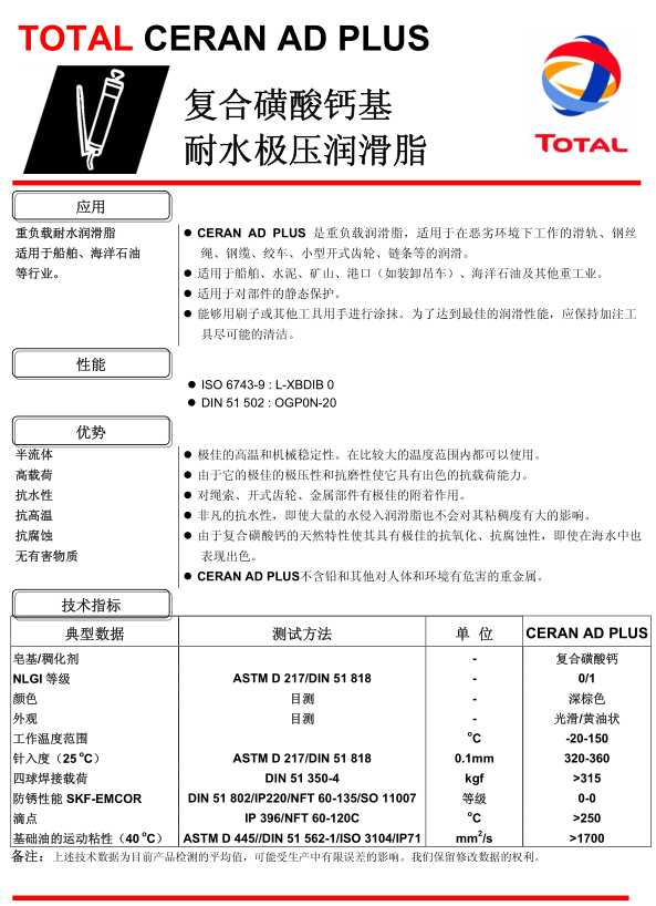 TOTAL CERAN AD PLUS 复合磺酸钙基耐水极压润滑脂