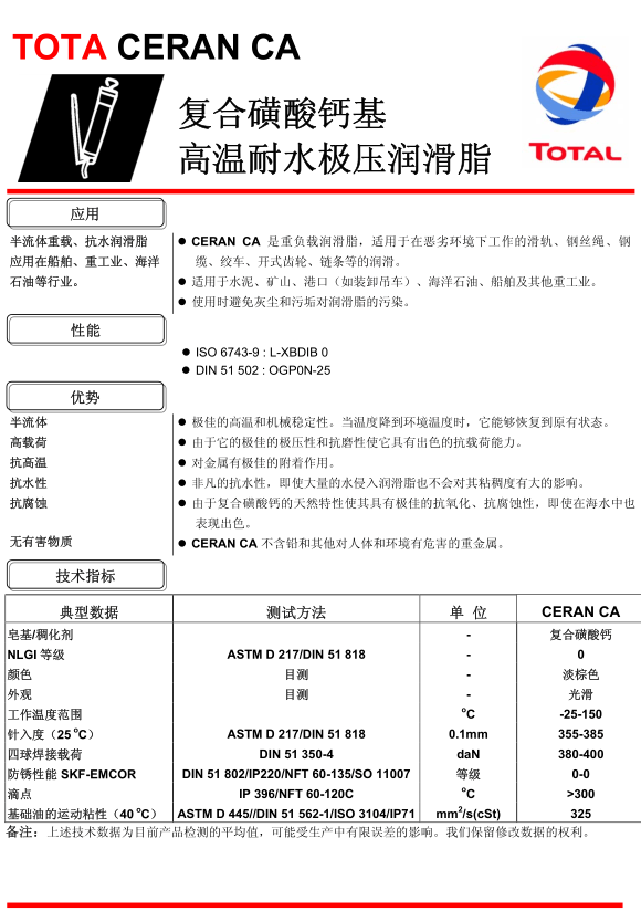 » 产品展示 » 道达尔润滑脂 » TOTA CERAN CA 复合磺酸钙基高温耐水极压润滑脂