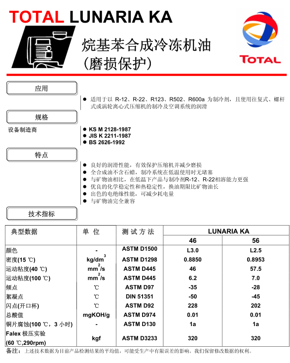 » 产品展示 » 道达尔冷冻机油 » TOTAL LUNARIA KA烷基苯合成冷冻机油-系列