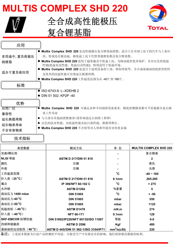 » 产品展示 » 道达尔润滑脂 » MULTIS COMPLEX SHD 220全合成高性能极压复合锂基脂