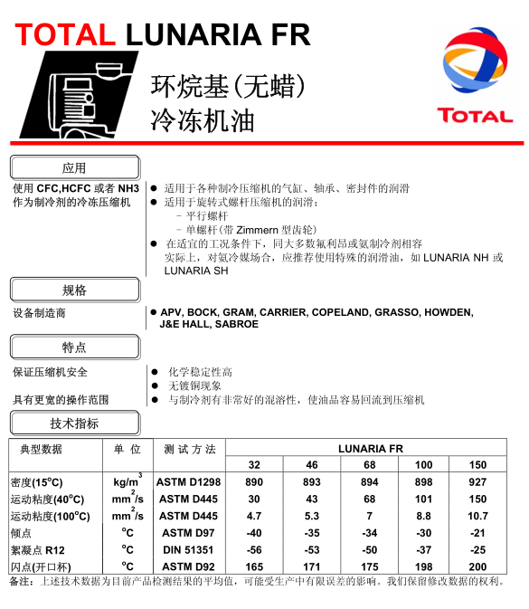 TOTAL LUNARIA FR 环烷基(无蜡)冷冻机油-系列
