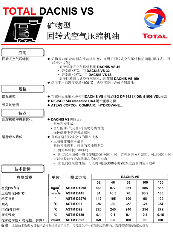 » 产品展示 » 道达尔空气压缩机油 » TOTAL DACNIS VS 矿物型回转式空气压缩机油-系列