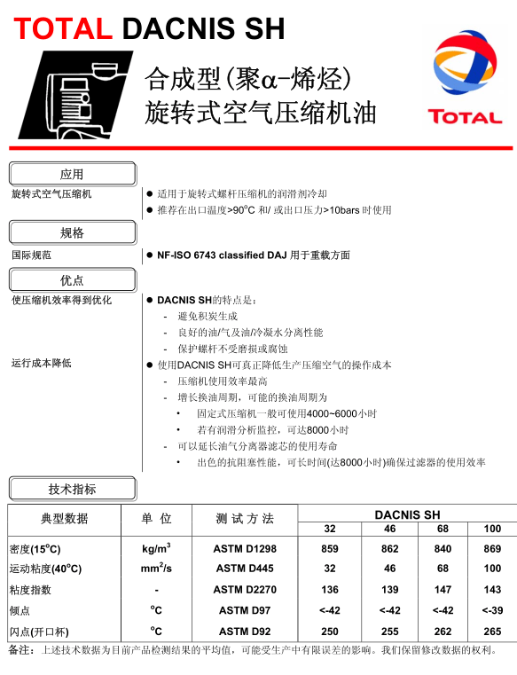 » 产品展示 » 道达尔空气压缩机油 » TOTAL DACNIS SH 合成型(聚-烯烃)空气压缩机油