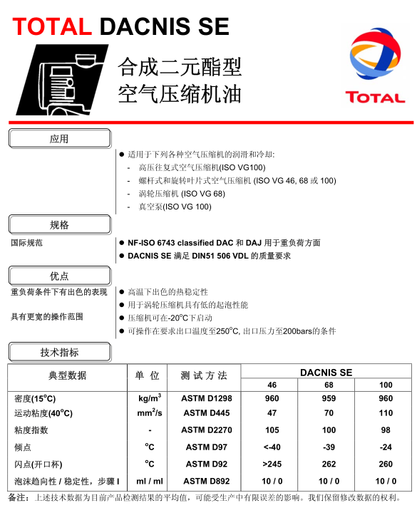 » 产品展示 » 道达尔空气压缩机油 » TOTAL DACNIS SE 合成二元酯型空气压缩机油-系列