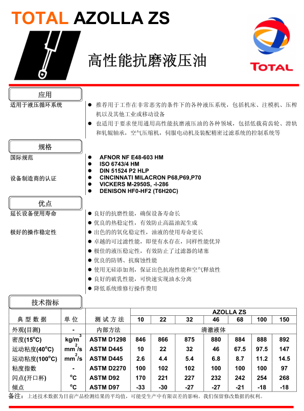 » 产品展示 » 道达尔液压油 » TOTAL AZOLLA ZS 高性能抗磨液压油-系列