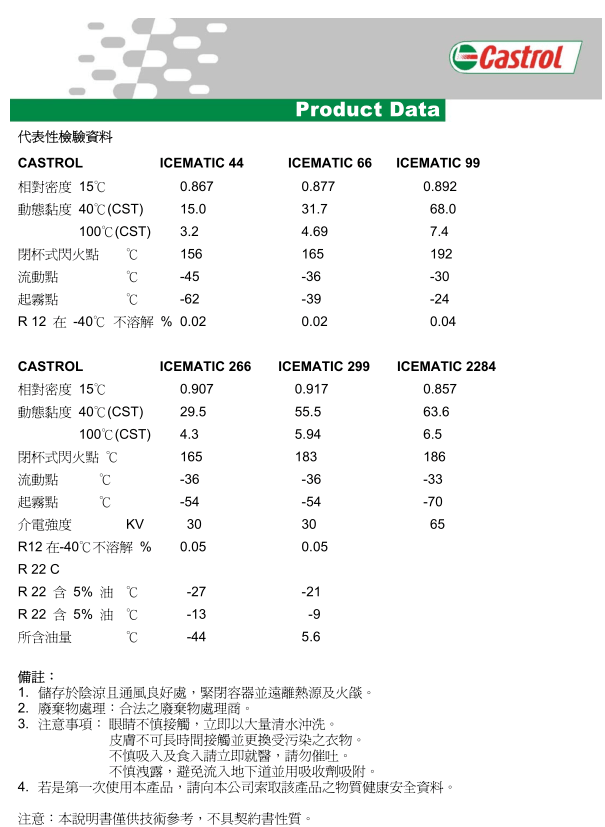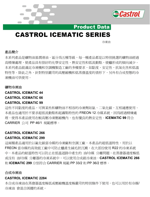 嘉实多 CASTROL ICEMATIC 冷冻机油 系列