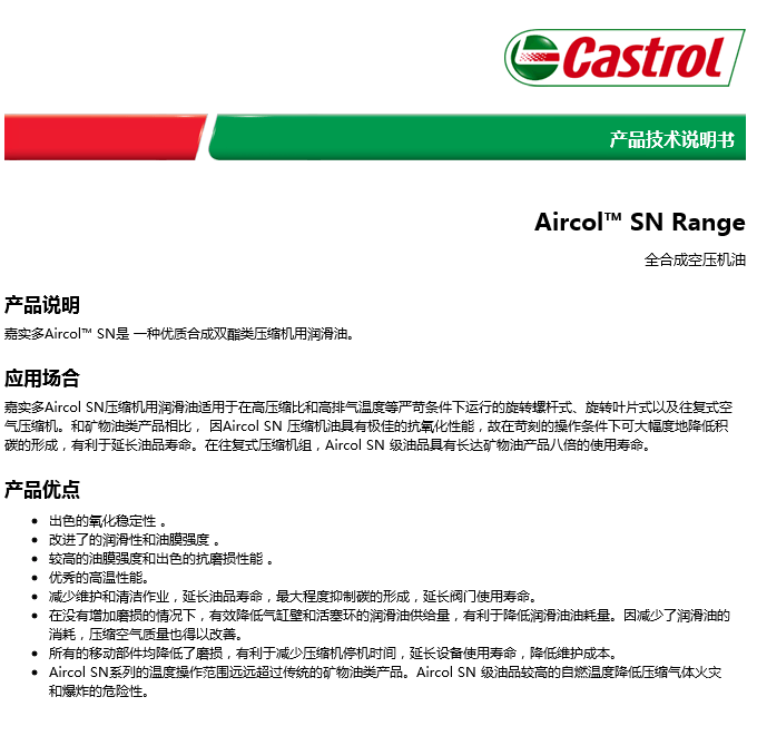 » 产品展示 » 嘉实多空气压缩机油 » 嘉实多Aircol SN 合成双酯类压缩机油 系列