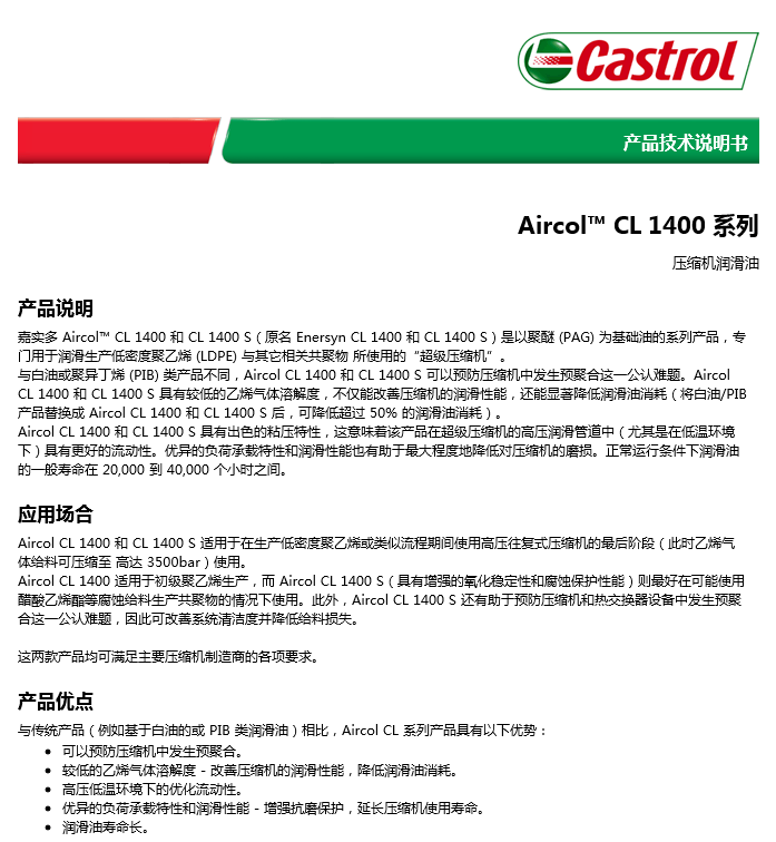 » 产品展示 » 嘉实多空气压缩机油 » 嘉实多 Aircol CL 1400 压缩机润滑油--系列