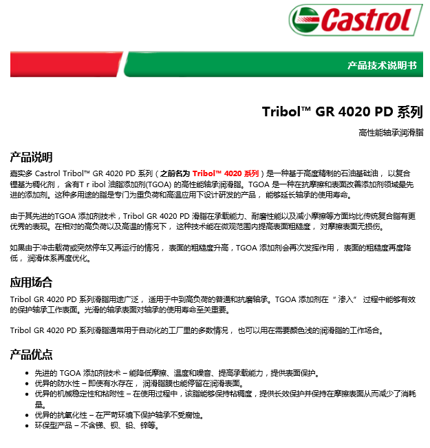 » 产品展示 » 嘉实多润滑脂 » 嘉实多 Tribol GR 4020 PD 轴承润滑脂-系列