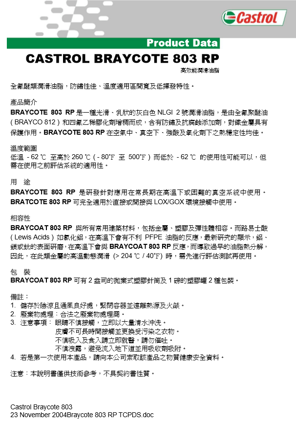 嘉实多 CASTROL BRAYCOTE 803 RP 全氟醚润滑脂