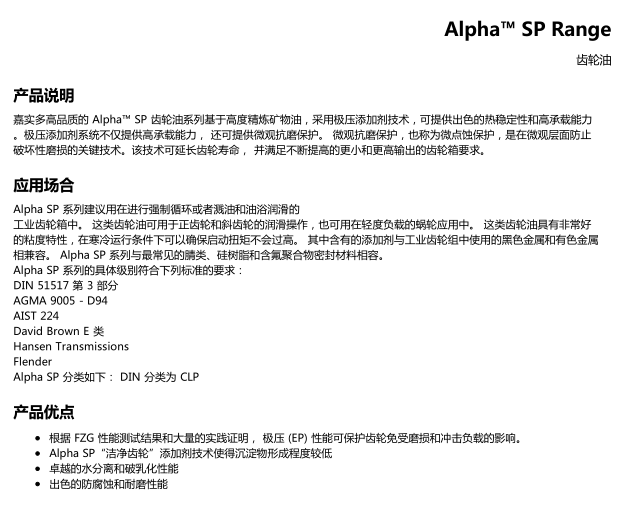 » 产品展示 » 嘉实多齿轮油 » 嘉实多 Alpha SP 工业齿轮油-系列