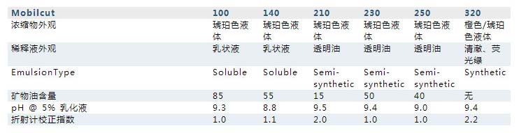 | Mobilcut 系列 水性金属加工液 产品简介 Mobilcut 是美孚高性能水溶性金属切削液产品线的商标。 Mobilcut 系列无氯产品采用最先进的基础油、添加物和乳化剂,为各种金属切削工艺提供可靠性能。 该产品设计成可在各类硬水和软水中运行,不易起泡,可长期抵抗机器和零件腐蚀。 Mobilcut 产品具有较低的维护频率和内在稳定性,旨在为以产品具备较长的使用寿命、卓越的加工性能和健康环保问题为提高生产力的重要因素的现代化车间而设计。 这类产品以浓缩液形式提供,使用前需要与水混合。 Mobilcut 100 是一种传统的乳状可溶物,可与水混合形成稳定的乳化剂。 其通用性能使其广泛适用于一系列铁及非铁物质的金属切削和研磨操作,此类操作以经济性能作为主要考量。 Mobilcut 140 是一种采用润滑剂增强的长效水性可溶液,是中型到重型负荷加工应用的理想选择。 其配方可提供较长的使用寿命并能防止细菌生长,同时,即便在困难的加工操作条件下,亦可有助于延长工具寿命并增加表面质量。 如果既要高效地用于一系列材料和应用,又要保持较长的使用寿命,那么 Mobilcut 140 是理想的选择。 Mobilcut 210 是一种高品质的半合成水溶性金属加工液,可在较大的水硬度范围内成透明乳化液。 其具有良好的清洁、冷却和切削特性,适用于轻型到重型负荷的切削和研磨应用。 Mobilcut 210 的配方特别适合铸铁的加工和研磨,同时有助于保持机器的清洁。 Mobilcut 230 是一种高效的半合成加工液,可在水中乳化形成稳定的微乳液。 该产品设计成广泛适用于各种水质并且,即便在高压系统中,亦可防止起泡。 Mobilcut 230 适用于一系列铁和非铁合金的应用,是合并金属加工液的理想选择。 相比传统可溶性油,在维护良好的情况下,Mobilcut 230 可延长冷却剂寿命,并维持高水准的加工性能。 Mobilcut 250 是一种高效的半合成加工液,为铝和和铝合金加工和需要尽可能降低加工件变色色的工艺增强性能而配制。 由于具有很高的润滑剂含量,该加工液还可提供高效的碳钢、合金钢和黄铜加工性能。 Mobilcut 320 是一种生物稳定、不含矿物油的金属加工液。 Mobilcut 320 旨在用于一般的研磨操作,此类操作中,高平面修饰、冷却和低起泡可能为主要要求。 该加工液将有助于保持砂轮的自由开放,便于其发挥其最大性能,并可极大程度地抑制细菌感染,维持较长的使用寿命。 特征和潜在效益 Mobilcut 系列产品旨在透过提供高效特性以增强现代化车间的生产力。