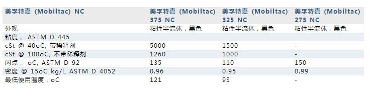 | 美孚特嘉 (Mobiltac) 375 NC, 325 NC 及 275 NC 是特高性能无铅稀释剂类厚重型开式齿轮润滑油,设计用于广泛的 开式齿轮和采矿应用。 它们含有无氯挥发溶剂,确保低温施用期间的流动性。施用后,稀释剂蒸发,使润滑油具有一种柔韧、粘性的高强度稠度,在润滑油的整个使用寿命期间都能保持这种稠度。美孚特嘉 (Mobiltac) 375 NC, 325 NC 及 275NC 能够牢牢附着在轮齿和其他机械元件上, 可以抵抗 过量抛离,因而能提供一层抗磨、粘性和连续的油膜,在边界润滑条件下进行可靠润滑。美孚特嘉 (Mobiltac) 275 NC 还含有固相极压 与抗磨添加剂,更增强对设备的保护性。 美孚特嘉 (Mobiltac) 375 NC, 325 NC 及美孚特嘉 (Mobiltac) 275C 在冷天不会硬化、碎裂或剥落,具有自行复原能力, 不会在齿根形成 坚硬的积垢。 极少出现滴油和抛被离,并且可以用浸有溶剂的布轻易地将润滑油清理干净。这些润滑油具有抗雨水、雪和加工用水冲 的能力。 它们的闪点使失火可能性降为最低。这些新一代齿轮和采矿润滑油可以通过手工或自动配给机进行施用。 美孚特嘉 (Mobiltac) NC 技术已迅速成为全世界众多开式齿轮使用者和矿场运营者的首选。 特性与优点 美孚特嘉 (Mobiltac) NC 系列产品代表美孚特嘉 (Mobiltac) 品牌产品的最新技术进步,数十年来在开式齿轮和采矿应用中取得极大成功。 这些新技术产品比旧式稀释剂类产品具有更好的环境效益和性能优势。它们具有以下特性与潜在效益: