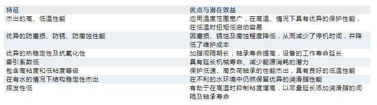 Mobilith SHC? 系列润滑脂是针对极端温度条件下的各种应用而研发的优质产品。本产品融合了合成基础油和高质量复合锂基增稠剂的独特性能。合成基础油的无蜡和低牵引系数特点(与矿物油相比),可提供出色的低温泵送性和极低的启动及运转扭矩。本系列产品具有节能潜力,并可降低圆锥滚子轴承和滚珠轴承负荷区的工作温度。复合锂基增稠剂则提供出色的粘附性、结构稳定性和抗水性。这类润滑脂的化学稳定性高,配方中含有特殊添加剂组合,具有卓越的抗磨、防锈和防腐能力,并可提供高、低温下的操作黏度。Mobilith SHC 系列润滑脂共分 7 个等级,其基础油的粘度介于 ISO VG 100 至 1500 之间,NLGI 级别则为 2 至 00。