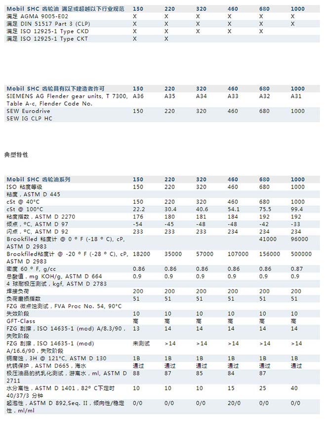 | Mobil SHC齿轮油系列是一款性能卓越的全合成型工业齿轮油,即使在极端条件下,亦能提供杰出的齿轮和轴承保护,且具有较长的油品寿命,有助于促进设备的无故障运行,并提高客户的生产力。 这类科学设计的合成润滑剂由合成基础油配制而成,合成基础油具有出色的氧化能力和热稳定性能,并具备极佳的低温流动性。 此类油品的粘度指数较高,粘度变化受温度影响较小,具有较大的运行温度范围,并可改善低温启动。 Mobil SHC 齿轮油系列润滑剂含有一种独有的先进添加剂系统,旨在提供极佳的保护功能,可使器械免受常规磨损,如刮擦,以及高水准的抗微点蚀疲劳能力。 此外,与常规齿轮油的化学性质相比,它可改善齿轮箱滚动轴承的润滑能力。 即使在有海水污染的情况下,相比常规齿轮油,Mobil SHC 齿轮油系列产品仍可提供杰出的抗锈抗腐蚀能力。 即使在潮湿环境下,这类油品都不会堵塞精细的滤清器,而且在高温下与黑色金属及有色金属具有杰出的兼容性。 在静态密封测试中,Mobil SHC 齿轮油亦表现出杰出/极佳的密封件兼容性。 这类油品具有杰出的极亚特性,即使在冲击负荷下亦能提供保护。 Mobil SHC 齿轮油系列油中所采用的合成基础油本身具有较低的牵引力特性,可减少不均一表面负荷区内的液体摩擦,如齿轮和滚动轴承的表面。 液体摩擦减少将降低运行温度并有助于提高齿轮效率。 Mobil SHC 齿轮润滑剂被推荐用于封闭式工业齿轮驱动,包括钢对钢直齿轮、斜齿轮和锥齿轮。 这类油被特别推荐用于防止微点蚀效应: 特别是带有齿面淬硬工艺的重负荷齿轮箱, 该类油品亦适用于极端的低/高温环境和严苛的腐蚀环境。 特性与优点 Mobil SHC 齿轮油系列润滑剂是 Mobil SHC 产品线的一部分,Mobil 产品因其创新与出色的性能已获得世界各国的认可和赏识。 这类由我们的科研人员开发的合成产品,象征着我们不断履行的承诺 — 采用先进技术提供具有出色平衡性能的润滑剂。 在开发 Mobil SHC 齿轮油系列的过程中最关键的一点是,我们的科学家和应用专家与主要的原始设备生产商 (OEM) 密切合作,确保我们的产品为不断发展的各类工业齿轮设计和齿轮运行状况提供出色的性能。 与原始设备生产商的合作效益不仅表现在产品可对抗某些重负荷、表面加硬的齿轮应用中出现的。 此类合作亦表明新型 Mobil SHC 齿轮油技术的综合平衡性能,包括较大的应用温度范围。 为解决微点蚀磨损问题,我们的产品规划科学家设计了一种独有的添加剂组合,可对抗传统的齿轮磨损以及微蚀磨损。 Mobil SHC 齿轮产品具有出色的油品寿命和沉积物控制,可对抗热分解/氧化和化学分解,是各种性能的良好平衡。 合成基础油组合技术(专利待批)亦提供传统矿物齿轮润滑油无法媲美的低温流动性能,对室外、低温应用具有重大助益。 Mobil SHC 齿轮油系列润滑剂提供以下潜在效益: