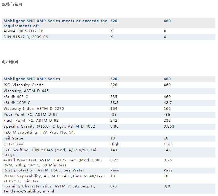 | Mobilgear SHC XMP Series (美孚齿轮油 SHC XMP系列) 合成齿轮油 产品简介 美孚齿轮油 SHC XMP系列高性能合成工业齿轮油,对即使在极 端恶劣条件下工作的设备 也能提供最佳保护,且具有较长的使用寿命。以美孚合成技术生产的聚?烯烃(PAO),因具备卓越的抗氧化与热稳定性能、固有的高粘度指数、优异的低温流动性以及不含矿物油常见的不良化合物而被选为基础油。在其基础油的高粘度指数与低牵引系数的共同作用下,可显著降低许多齿轮传动装置的能量消耗。美孚齿轮油 SHC XMP系列含有先进的、精心调配的专利添加剂配方,不但对传统的磨损模式如刮伤提供优异的保护,而且对微点蚀疲劳也能提供高水平的保护。此外,与传统的齿轮油化学成分比较,它能改进齿轮箱的滚动组件轴承的润滑作用。与传统齿轮油相比,美孚齿轮油 SHC XMP系列产品可为在有海水和酸性水侵入的应用提供卓越的防锈防腐蚀保护。即使在适度潮湿的情况下,这些产品可显著地延长过滤器的使用寿命,也没有堵塞精密过滤器的趋势。即使在温度逐渐升高时,与铁及有色金属都有优异的兼容性。 美孚齿轮油 SHC XMP系列推荐用于密封式工业齿轮传动装置,包括钢对钢直齿轮、斜齿轮和伞齿轮。我们强烈推荐用于可能产生微点蚀、特别是轮齿经表面淬火硬化处理的重负荷齿轮箱。该类油品亦适用于极端的低/高温环境和严苛的腐蚀环境。 由于它们具备许多独特的性能,包括抗微点蚀能力、在艰难的应用条件下所表现的性能,以及适用的工作温度幅度大等,使美孚齿轮油 SHC XMP系列产品在全世界用户与原始设备制造商(OEM)之间,声誉日隆。 特性与优点 以SHC命名的美孚品牌润滑油,因其创新及杰出的性能而受举世公认和赏识。含有由本公司的研究科学家领先开发的聚?烯烃合成基础油,正是本公司承诺继续不断地采纳先进技术,提供杰出产品的象征。美孚齿轮油 SHC XMP系列产品成功开发的关键因素之一, 即是 我们的科学家与产品应用专家,与主要的原设备制造商之间紧密联系,确保我们的产品在飞速发展的工业齿轮设计与应用方面, 具备卓越的性能。 我们与设备制造商的合作,帮助我们确证来自本身的实验室的测试结果,显示美孚齿轮油 SHC XMP系列润滑油卓越的性能。 在与原设备制造商合作中发现的众多可贵效益之一,是有能力防止表面经热处理而硬化的高负荷齿轮发生微点蚀的现象。这项合作也显示,新的美孚齿轮油 SHC XMP技术所达到的性能优越性全面平衡,包括应用温度范围广。 为了解决微点蚀的问题,我们的产品配方科学家们设计了一种专利的添加剂组分,除了能够防止传统的齿轮磨损外,也能够防止微点蚀发生。我们的配方专家选用了专利的聚?烯烃合成基础油,延长了油品寿命,并且有效地控制了积炭的产生,还具有极佳的抗热、氧化及化学裂解的性能以及各项性能达到平衡。合成基础油的无蜡本质使矿物油产品的低温流动性无法以之抗衡;对於偏远地区、环境温度低的应用,这是重要的长处。美孚齿轮油 SHC XMP系列润滑油的其他优点如下:
