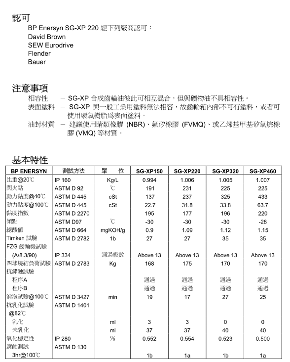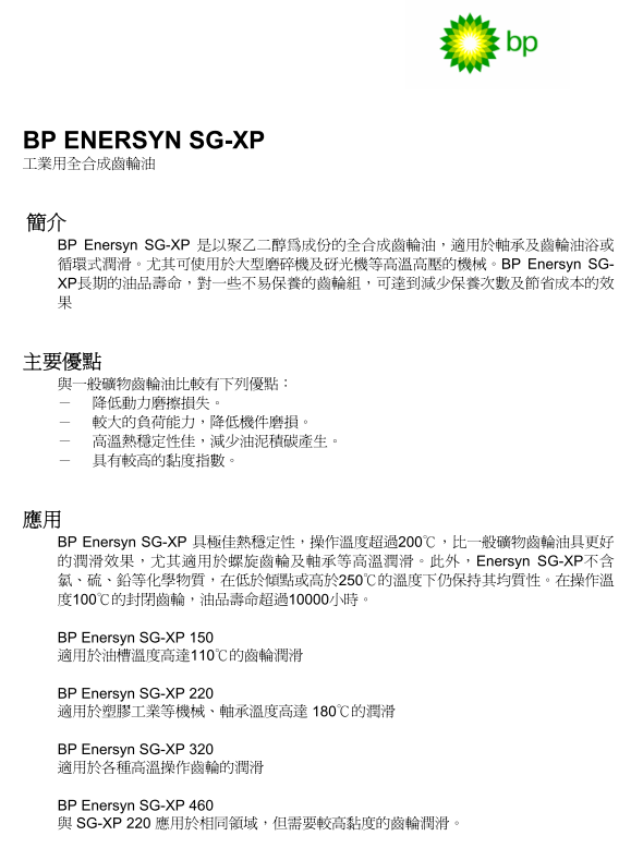 | BP安能欣Enersyn SG-XP 合成齿轮油 BP Enersyn SG-XP150、220、320、460、680 产品简介:BP安能欣Enersyn SG-XP优质合成齿轮油是以聚烯乙二醇为基础。用于循环以及齿轮和轴承的油浴润滑,尤其是在高温和高压下工作的轧机和压延机。对于那些难以维护的齿轮和蜗轮齿轮装置,其较长的换油周期时维护更方便。同时,它们用的配方可提供极好的防腐性和抗乳化性。