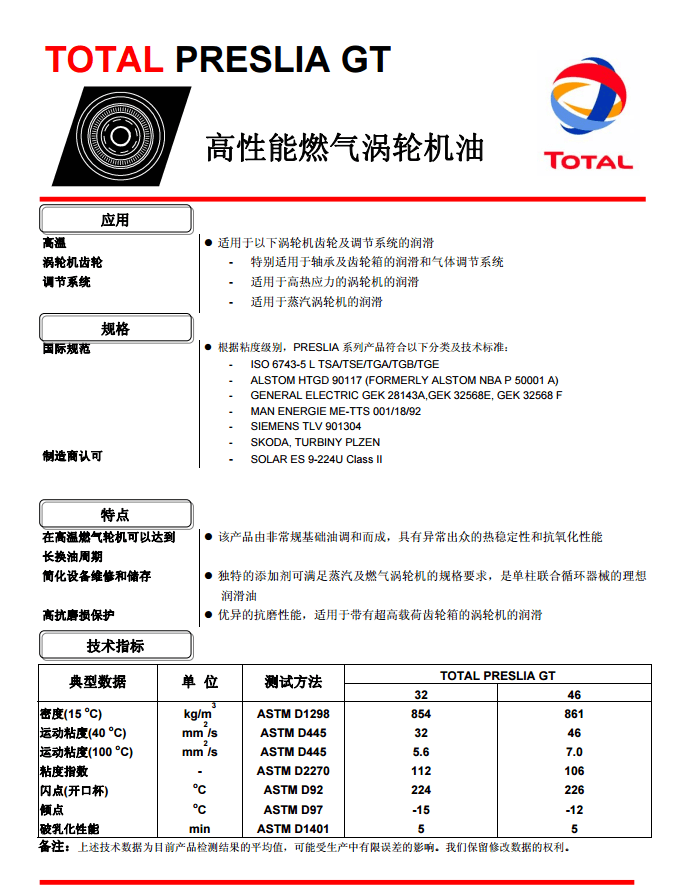 » 产品展示 » 道达尔涡轮机油 » TOTAL PRESLIA GT 高性能燃气涡轮机油 系列